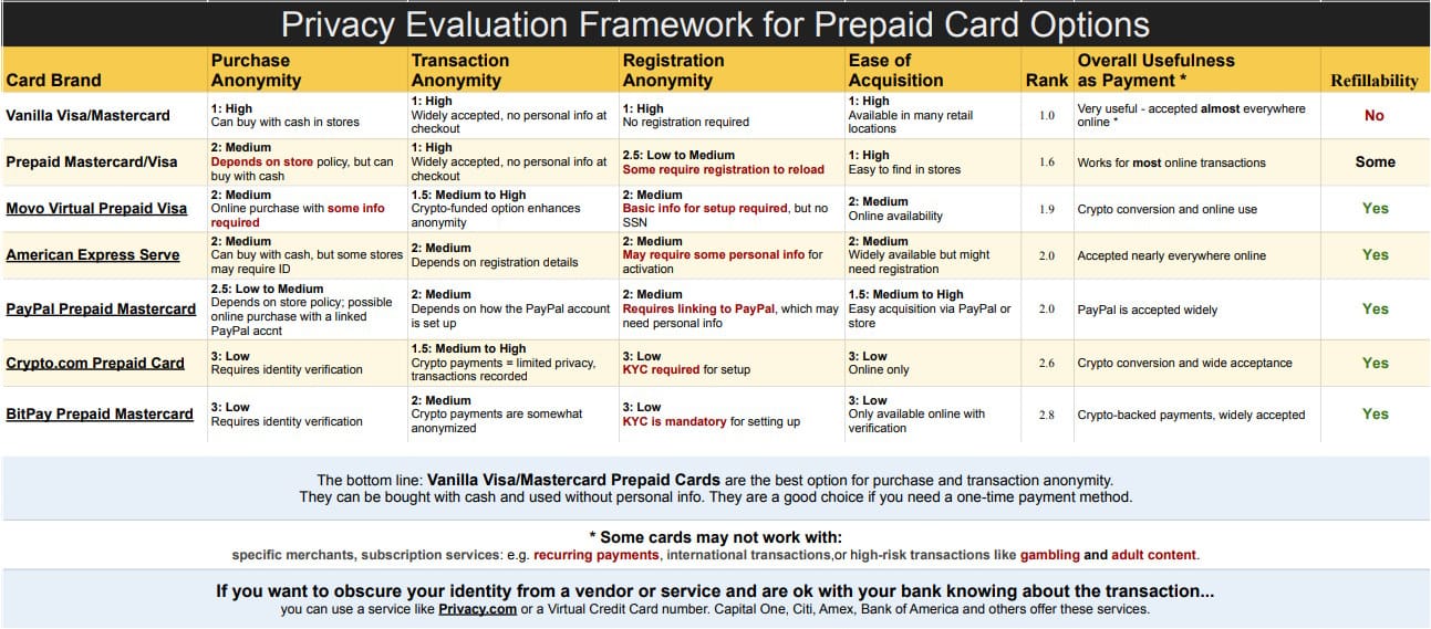 - Anonymous Payments: Use prepaid cards or cryptocurrency to avoid linking payments to your identity. See our guide here for how to pay with privacy. For highest anonymity, we recommend Vanilla Visa/Mastercard Prepaid Cards.